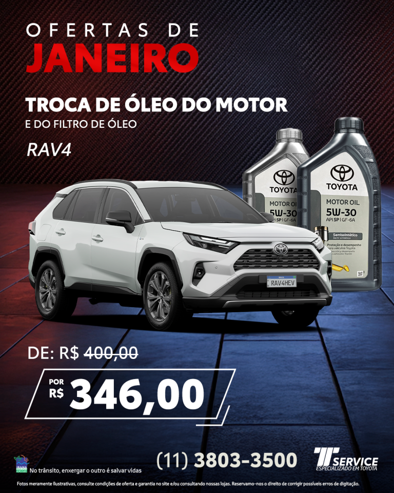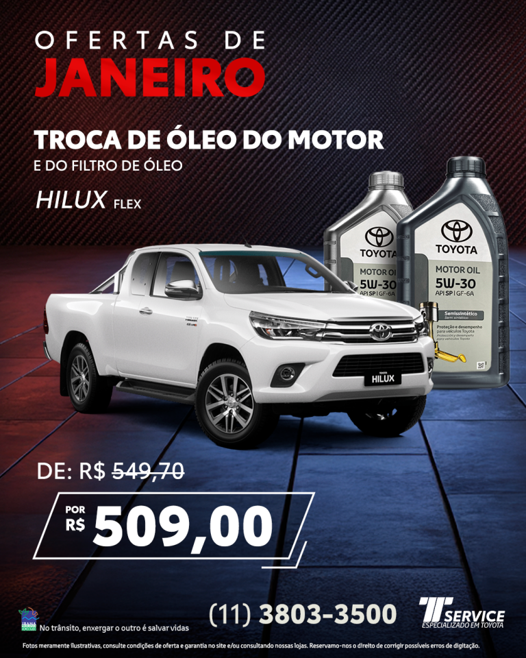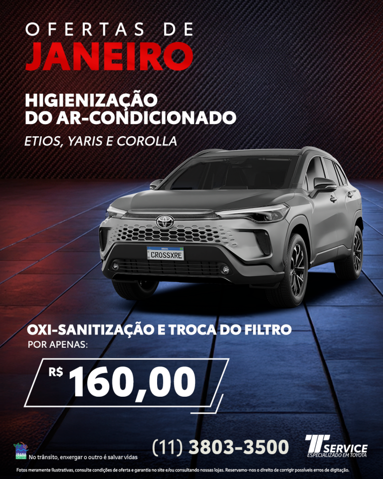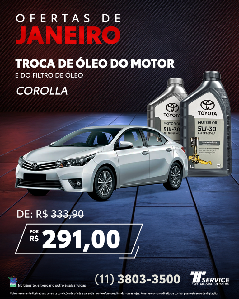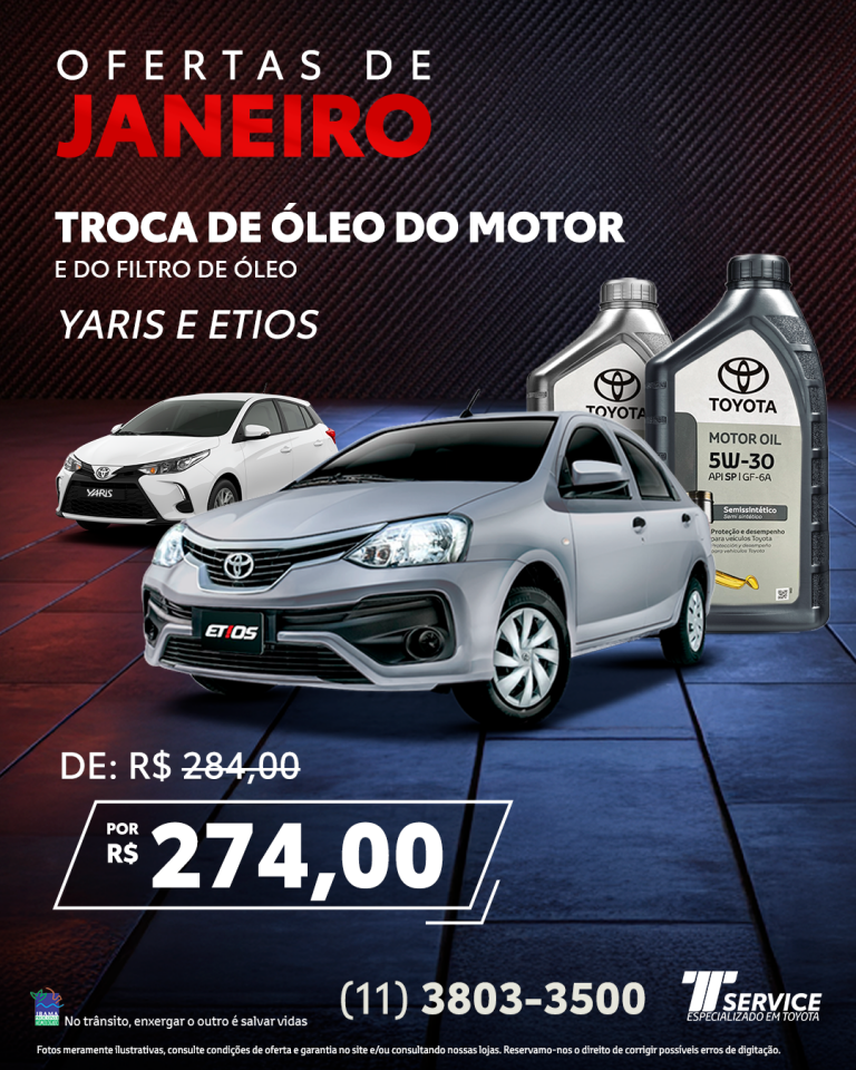 Ofertas Ofertas TService Itavema Higienização do ar-condicionado Etios, Yaris e Corolla Oxi-sanitização e troca do filtro Por apenas: R$ 160,00 WHATSAPP Toda a linha de pneus 10% de desconto Montagem e alinhamento grátis na de 2 pneus ou mais. WHATSAPP Troca de óleo do motor 5W30e do filtro de óleo Etios e Yaris De: R$ 284,00Por: R$ 247,00 WHATSAPP Troca de óleo do motor e do filtro de óleo Corolla De: R$ 333,90Por: R$ 291,00 WHATSAPP Troca de óleo do motor e do filtro de óleo RAV4 De: R$ 400,00Por: R$ 346,00 WHATSAPP Troca de óleo do motor e do filtro de óleo Hilux Flex De: R$ 549,70Por: R$ 509,00 WHATSAPP Troca de óleo do motor e do filtro de óleo Hilux Diesel De: R$ 449,00Por: R$ 409,00 WHATSAPP Promoção Clássicos Toyota Venha até a TService, realize um serviço de revisão básica conosco e ganhe uma caneca exclusiva! Consulte Condições